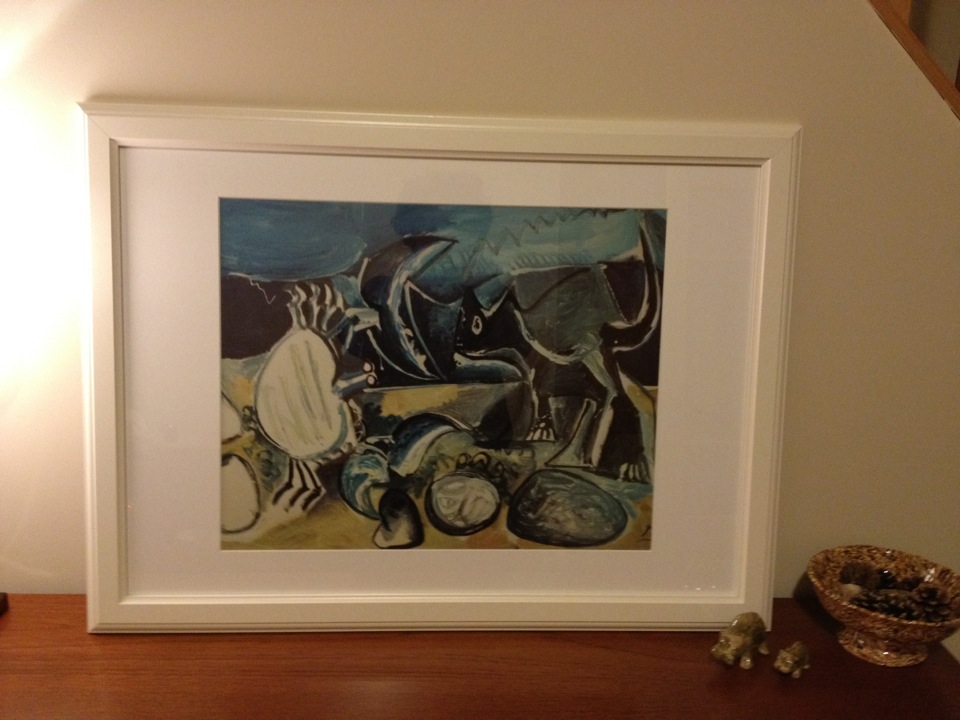 The frame mount isn’t the right size, so there’s a chunk of the image obscured, but Cat and Crab on the Beach will look very at home on my chimney breast once the correct mount is in situ.